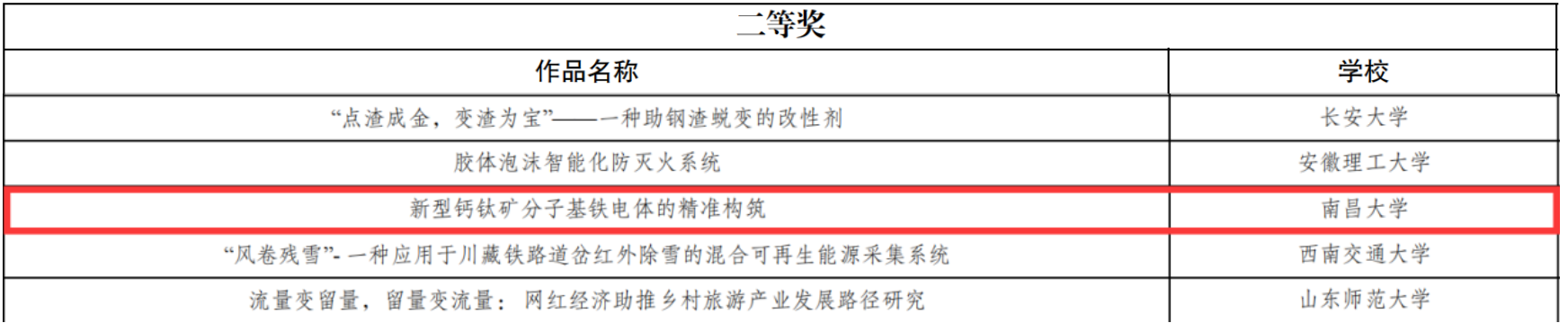 3月28日,四川大学承办的第十七届“挑战杯”全国大学生课外学术科技作品竞赛终审决赛闭幕,南昌大学化学化工学院2018级邓斌斌、程婷婷、胡艳婷、程书平四位本科生的自然科学类作品《新型钙钛矿分子基铁电体的精准构筑》在国际有序物质科学研究院的指导下喜获全国二等奖。